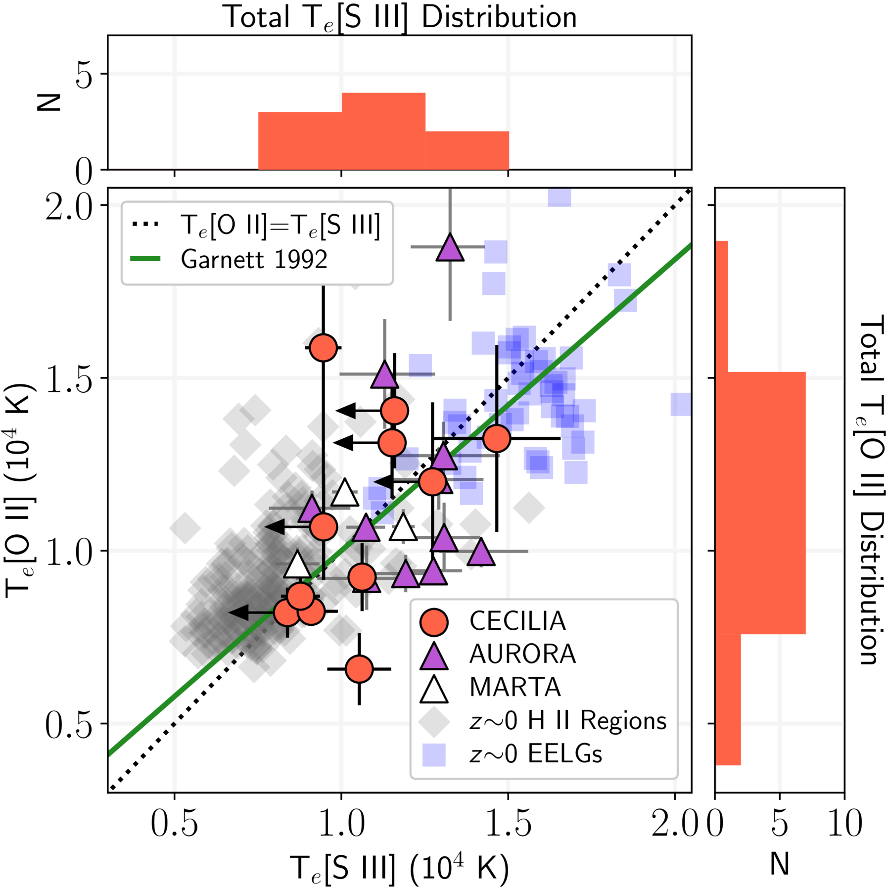 Simultaneous Te[O II] and Te[S III] measured in the CECILIA sample (red circles; 3σ Te[S III] upper limits provided with black arrows), local EELGs (blue squares), and the metal-rich CHAOS H II regions (gray diamonds). We also include direct Te from the AURORA (R. L. Sanders et al. 2025b) and MARTA surveys (E. Cataldi et al. 2025; M. Curti et al. 2025a) as purple and white triangles, respectively. The theoretical Te scaling relation from D. R. Garnett (1992) is plotted in green, while the black dotted line indicates equivalent Te[O II] and Te[S III]. The histogram distributions of the 17 Te[O II] and 9 Te[S III] measurements in CECILIA are provided in the right and top panels, respectively. The high-z Te are generally consistent with those measured in the local Universe and from photoionization model predictions, but there are currently insufficient data to assess the scatter in Te[O II]–Te[S III] at high z.