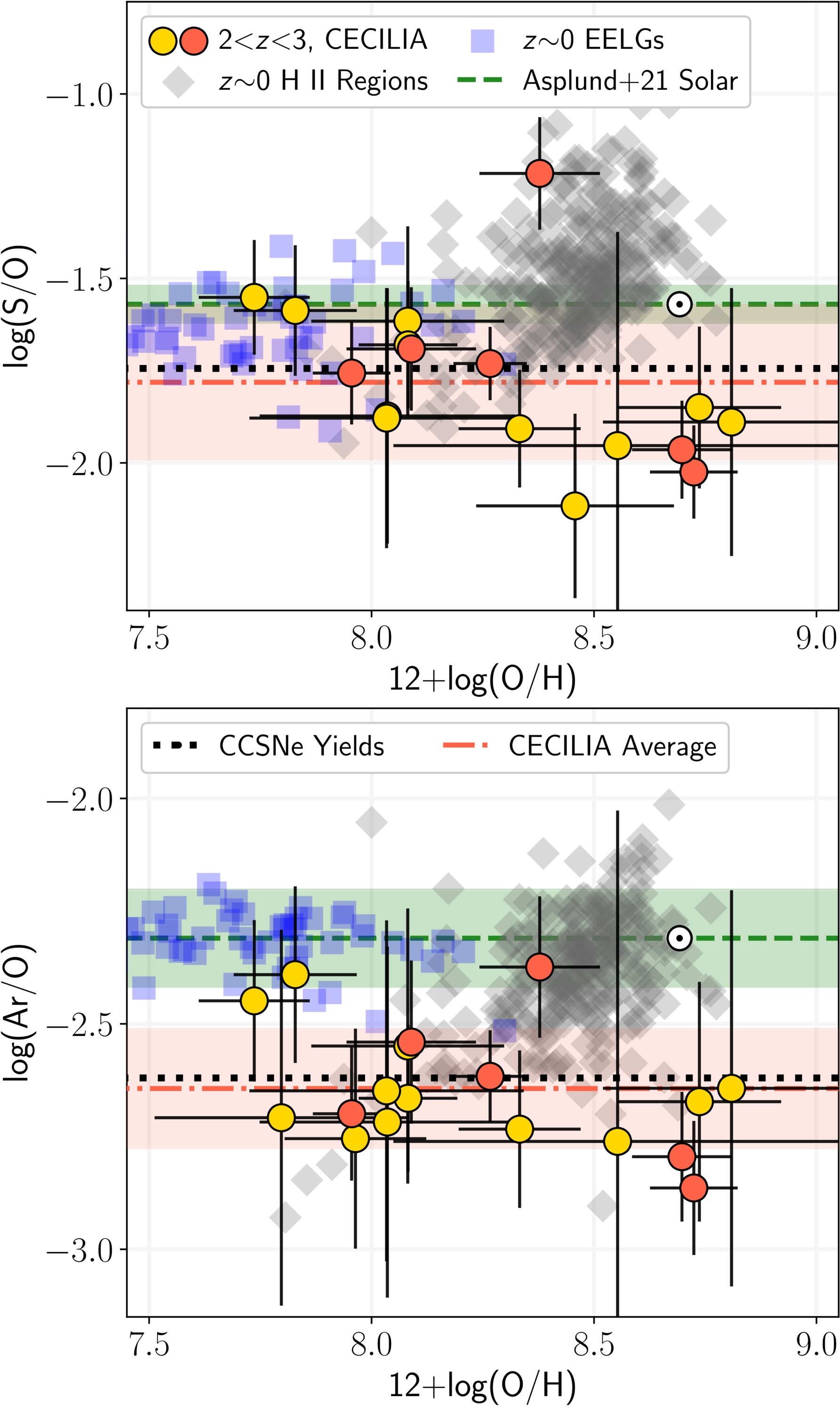 Direct abundance trends of S/O (top) and Ar/O (bottom) vs. 12 + log(O/H) for the CECILIA galaxies. Shape and coloring of the data are similar to Figures 5 and 6. The solar abundance ratio from M. Asplund et al. (2021) is represented as the circled dot and dashed green line with shaded area. The red dashed–dotted line and shaded area represent the average S/O and Ar/O abundance ratios and their uncertainties, respectively, from the full CECILIA sample. The dotted black line is the abundance ratio predicted from metal-poor CCSN yields of C. Kobayashi et al. (2006). Consistent with the abundance trends in D40 (N. S. J. Rogers et al. 2024) and other high-z galaxies, S/O and Ar/O are significantly subsolar in the typical SFG at Cosmic Noon. This abundance pattern is expected for a galaxy with significant CCSN enrichment, with minimal Type Ia contributions owing to the abbreviated SFH at z > 2.