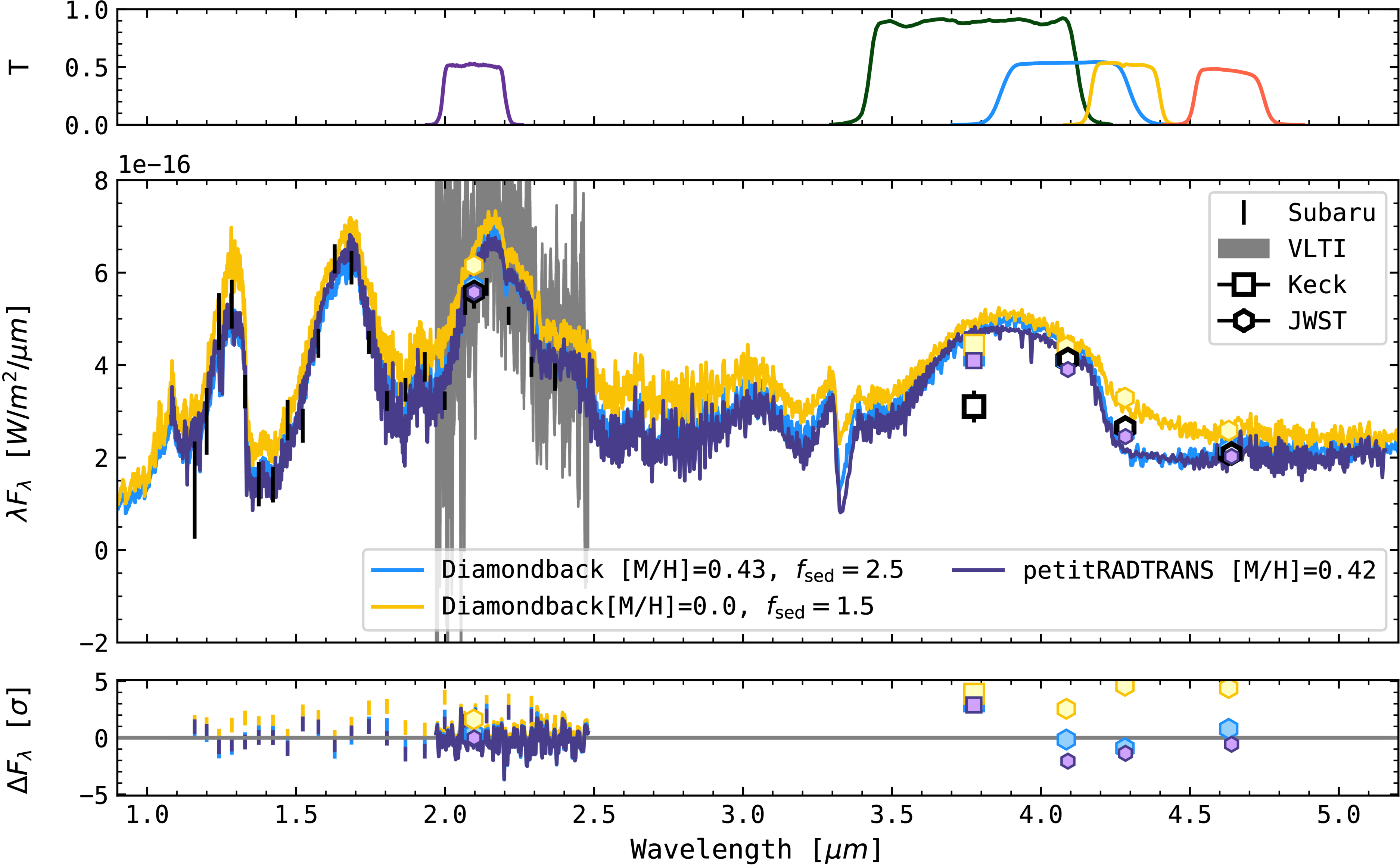 Comparing the spectrum of 29 Cyg b to atmospheric models. Top: the transmission functions of the photometry considered in the fit. Middle: RCE models from Sonora Diamondback are shown in blue and yellow, and a parametric model generated with petitRADTRANS is shown in purple. Observations from Subaru, the VLTI, Keck, and JWST are plotted in black and gray, and the models integrated across the filter transmission functions are shown as the smaller colored scatter points. The maximum a posteriori spectrum (a linear interpolation across the published grid of spectra, with [M/H] = 0.43 and fsed = 2.5) is shown in blue, and a similar model with a solar metallicity ([M/H] = 0.0) and stronger cloud sedimentation (fsed = 1.5) is shown in yellow. The median model has a reduced χ2 = 1.0. The models with enhanced metallicity in the Diamondback grid provide a better fit to the absorption feature from CO2 at 4.3 μm, while the metallicity-dependent JHK-band spectral slope could be reproduced by changing the model’s cloud parameters (in this case, the sedimentation efficiency fsed). The more flexible P-T structure and cloud parameterization in the best-fitting pRT model are able to reproduce the K-band observations, the JHK-band spectral slope, and the 4–5 μm photometry at once, while preserving the surface gravity and radius predicted by the dynamical mass and evolutionary models. The median pRT model has a reduced χ2 = 1.0. Bottom: residuals (in units of standard deviation) between the models and the observations as a function of wavelength.