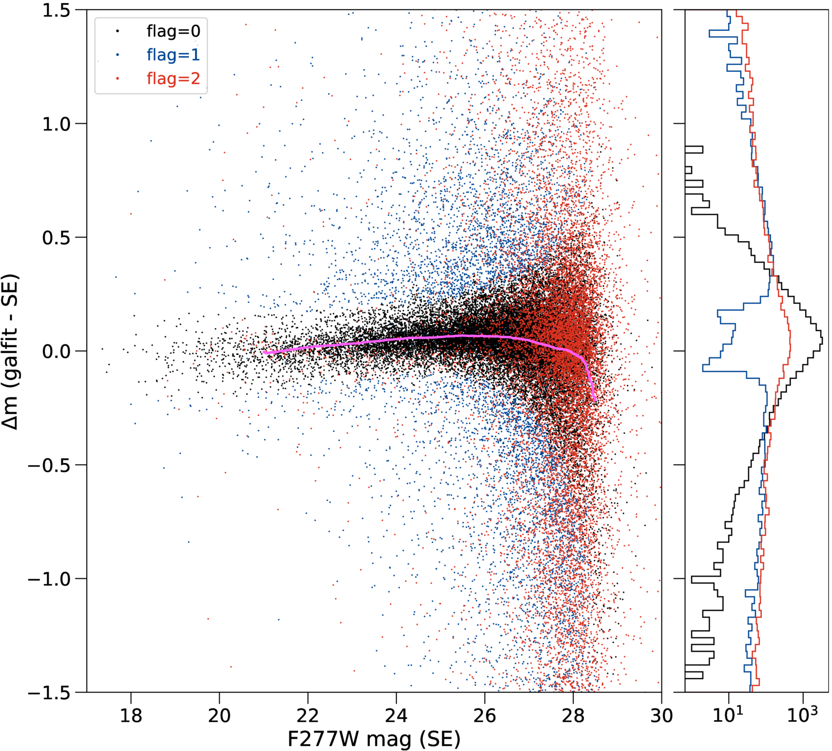 Left: difference between F277W GALFIT model magnitudes and SExtractor magnitudes for galaxies where the GALFIT solution converged successfully (89% of all sources). The magenta line shows the running median of the offset between the two magnitudes. Galaxies with good fits (flag = 0) are shown in black. Galaxies whose GALFIT magnitude is more than 3σ away from the median offset (flag = 1) are shown in blue. Galaxies whose fits reached a constraint limit in one or more parameters (flag = 2) are shown in red. Right: histogram of sources as a function of difference between the F277W GALFIT magnitude and SExtractor magnitude. Colors are the same as in the left-hand panel.
