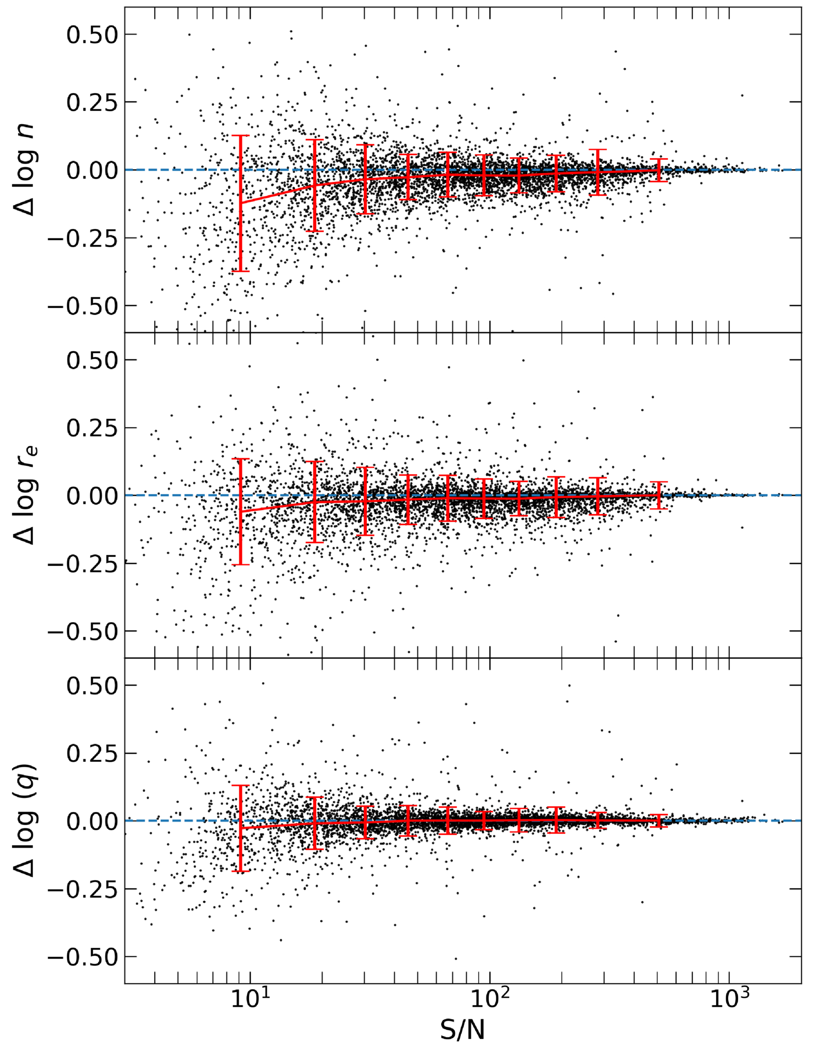 Difference between the recovered and input parameters for simulated galaxies as a function of SNR, where positive (negative) values represent larger (smaller) recovered parameters. Trends are shown in red for 10 bins containing equal numbers of galaxies. Error bars represent the dispersion of values within each SNR bin. The blue dashed line represents equality between the input and recovered parameters. Two features are evident: (1) at lower SNR, there is a larger dispersion, implying more uncertainty in the recovered parameters, and (2) at lower SNR we find that the parameters are biased toward smaller recovered values. For Sérsic index, n, we find the largest bias, reaching 0.12 dex at SNR = 10, while re is biased smaller by 0.05 dex and q by 0.025 dex at the same SNR.