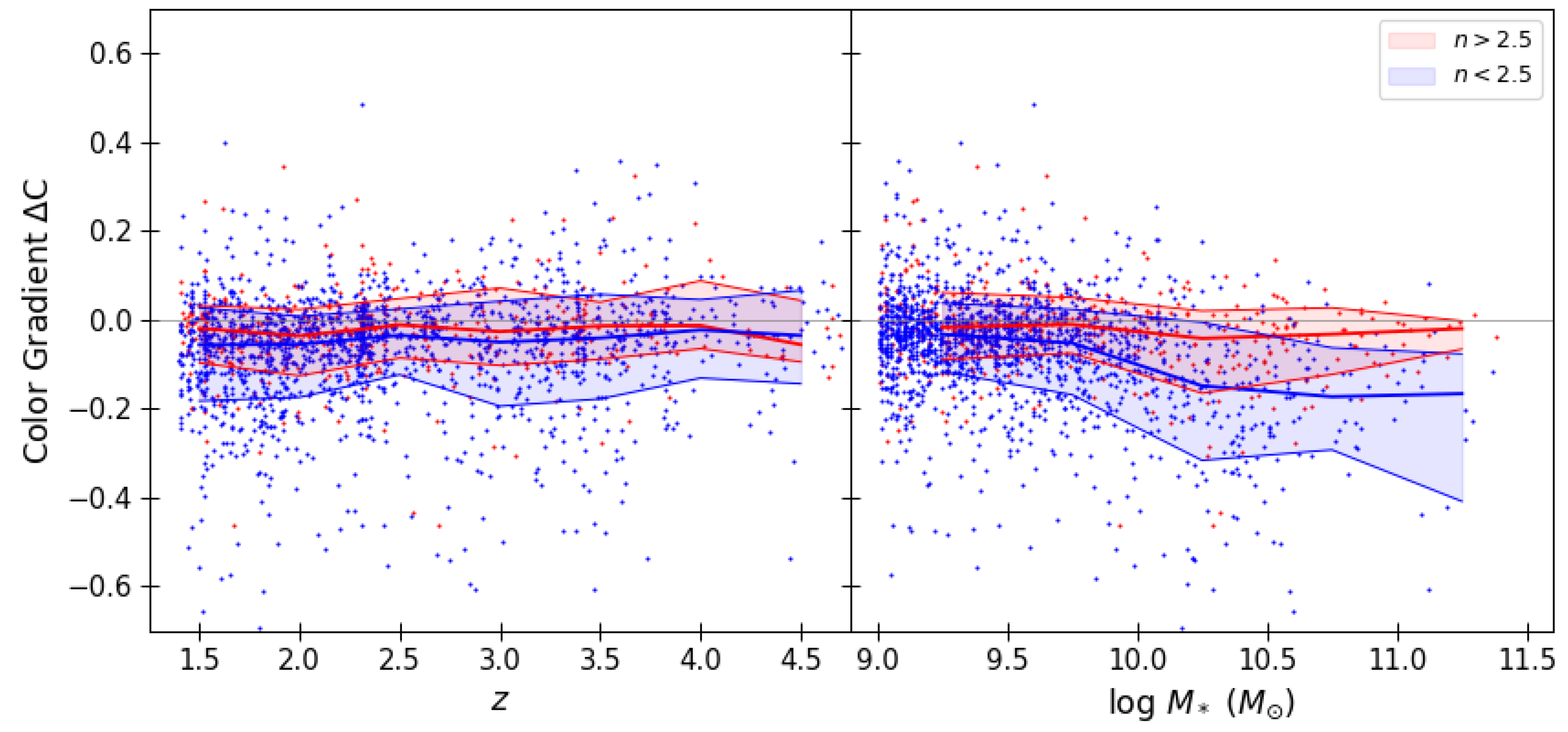 Color gradient, as defined in Equation (3), is shown as a function of redshift and mass. Individual galaxy points are color coded according to their Sérsic index with n < 2.5 shown as blue, and n > 2.5 shown as red. The mean relation, along with the 16th−84th percentile range are shown for n < 2.5 and n > 2.5 galaxies as the blue and red lines and shaded regions, respectively. We find that there is no evidence for variation in color gradients as a function of redshift for either low- or high-Sérsic-index galaxies, and color gradients are slightly negative on average. We also find evidence for larger color gradients among the most massive galaxies, a trend that is most evident for low-n sources.