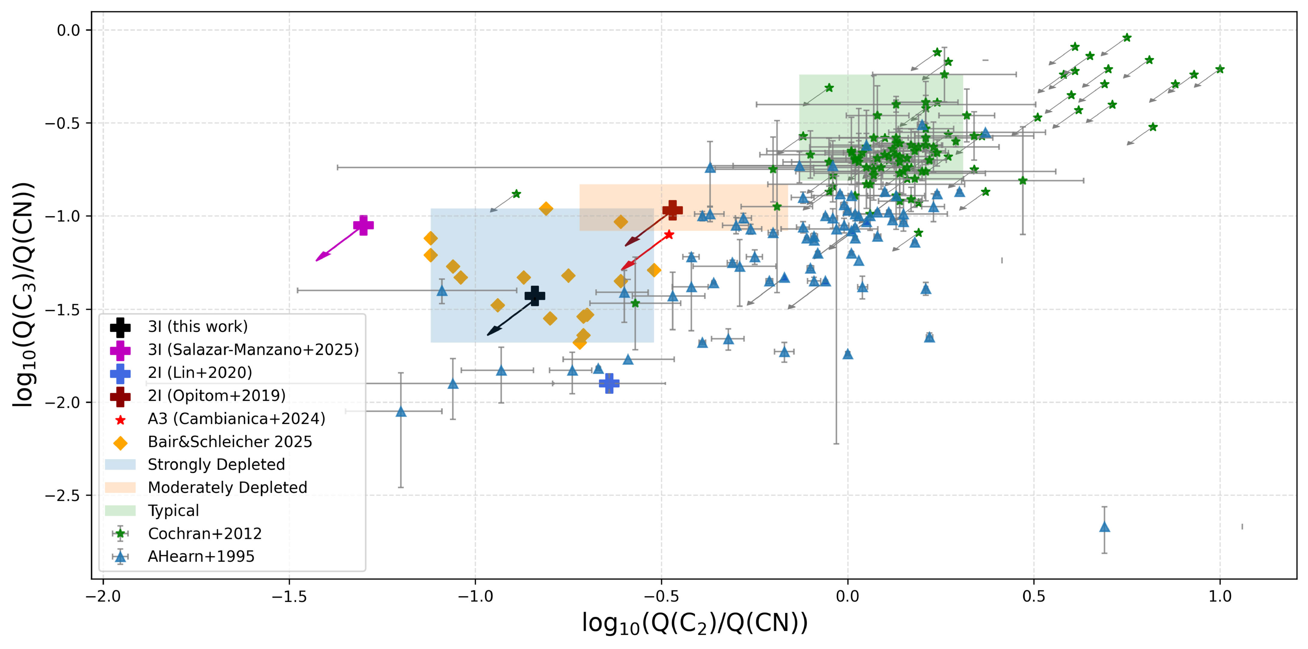 Comparison between carbon depleted comets and 3I. Shaded areas represent the edges of various depletion levels defined in Table 5 of B&S25. Diamond-shaped data points are strongly depleted comets selected in their work. The A’Hearn data were taken from D. J. Osip & M. A’Hearn (2003).