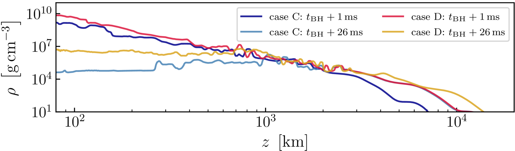 Rest-mass density profiles along the z-axis (south side) for cases C and D, at 1 ms or 26 ms after BH formation.