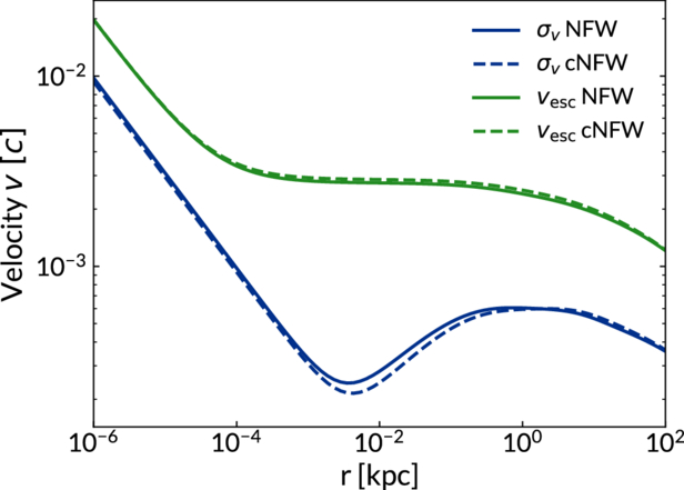 DM velocity profiles as a function of radial distance from the GC for the velocity dispersion σv (blue) and escape velocity vesc (green) for NFW (solid) and cNFW (dashed) DM density distributions. The cNFW profile has inner slope γ = 1.2.