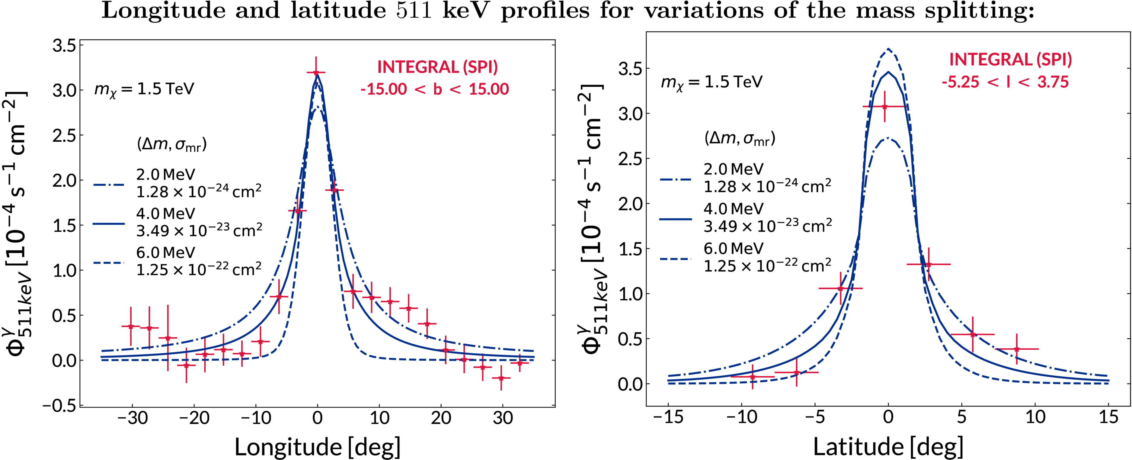 Same as in Figure 1, but for a fixed mass of mχ = 1.5 TeV with different variations of Δm that are compatible with the IfA signal observed by COMPTEL.
