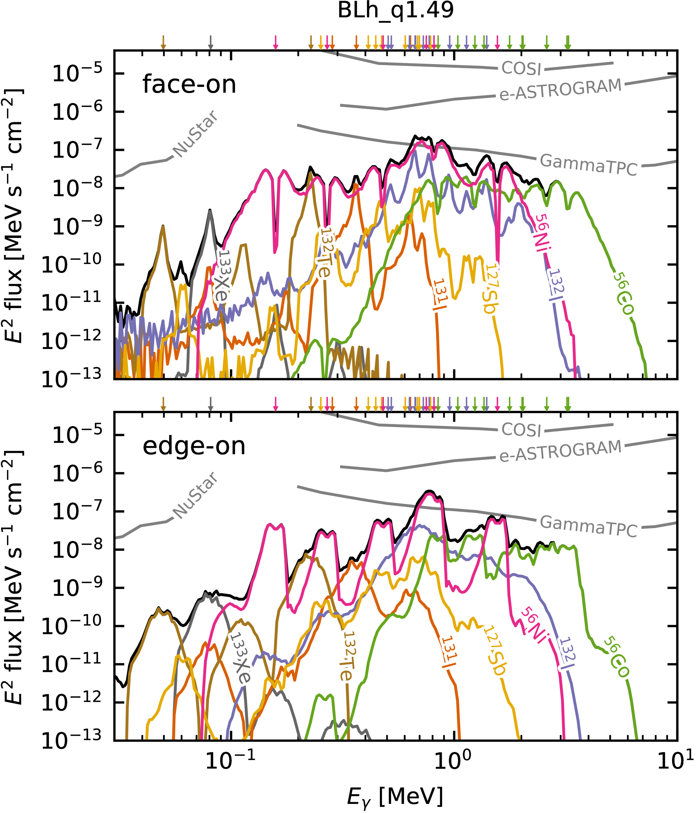 γ-ray emission spectrum at t = 7 days for BLh_q1.49 at 40 Mpc for a polar (upper panel) and an equatorial (lower panel) viewing angle. Colored lines and arrows on top of the panels indicate the contribution of individual isotopes and the original line positions, respectively. Gray lines show the sensitivity of the NuStar, COSI, e-ASTROGRAM, and GammaTPC telescopes.
