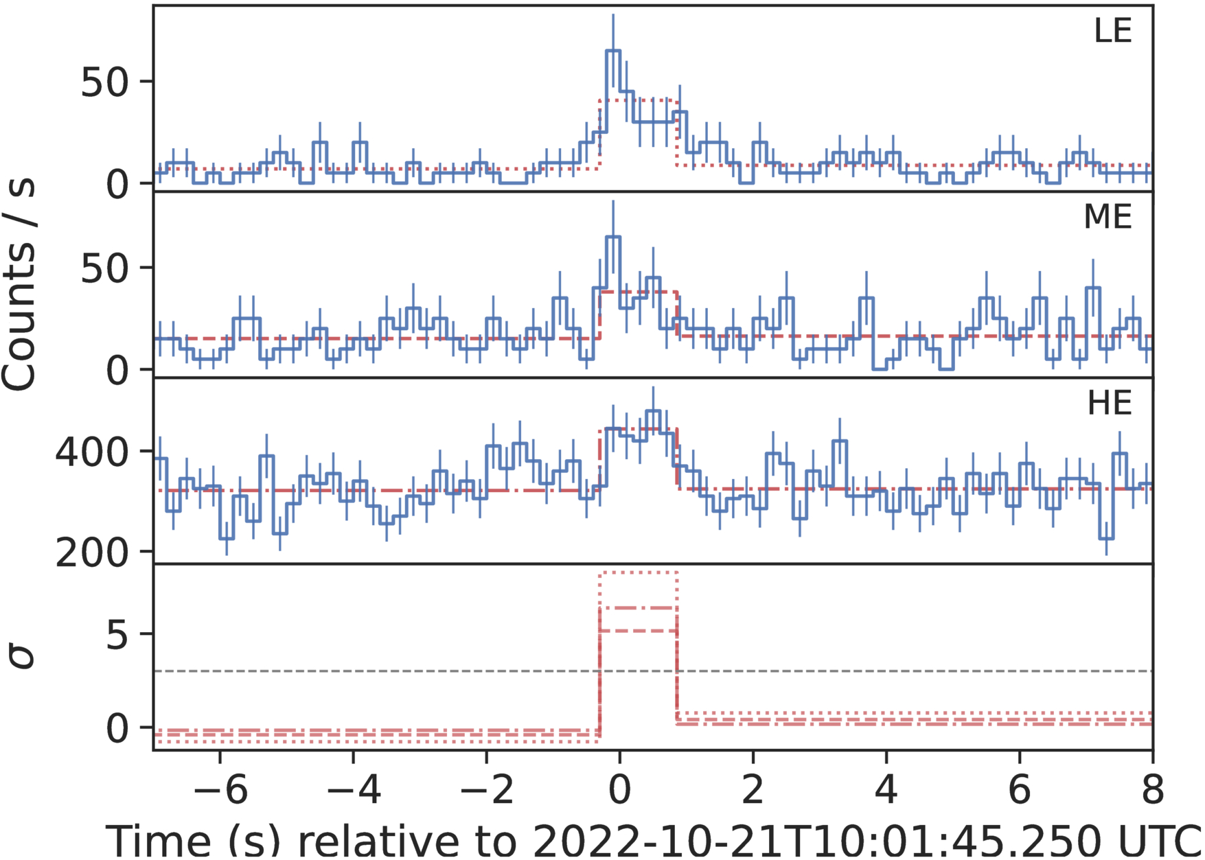 Light curves and Bayesian block representations of MXB 221021. The top three panels show the light curves (blue) and the corresponding Bayesian blocks (red) from three telescopes. The fourth panel presents the Bayesian block significance for LE (dotted), ME (dashed), and HE (solid), evaluated against the background. The gray dashed line marks the 3σ threshold.