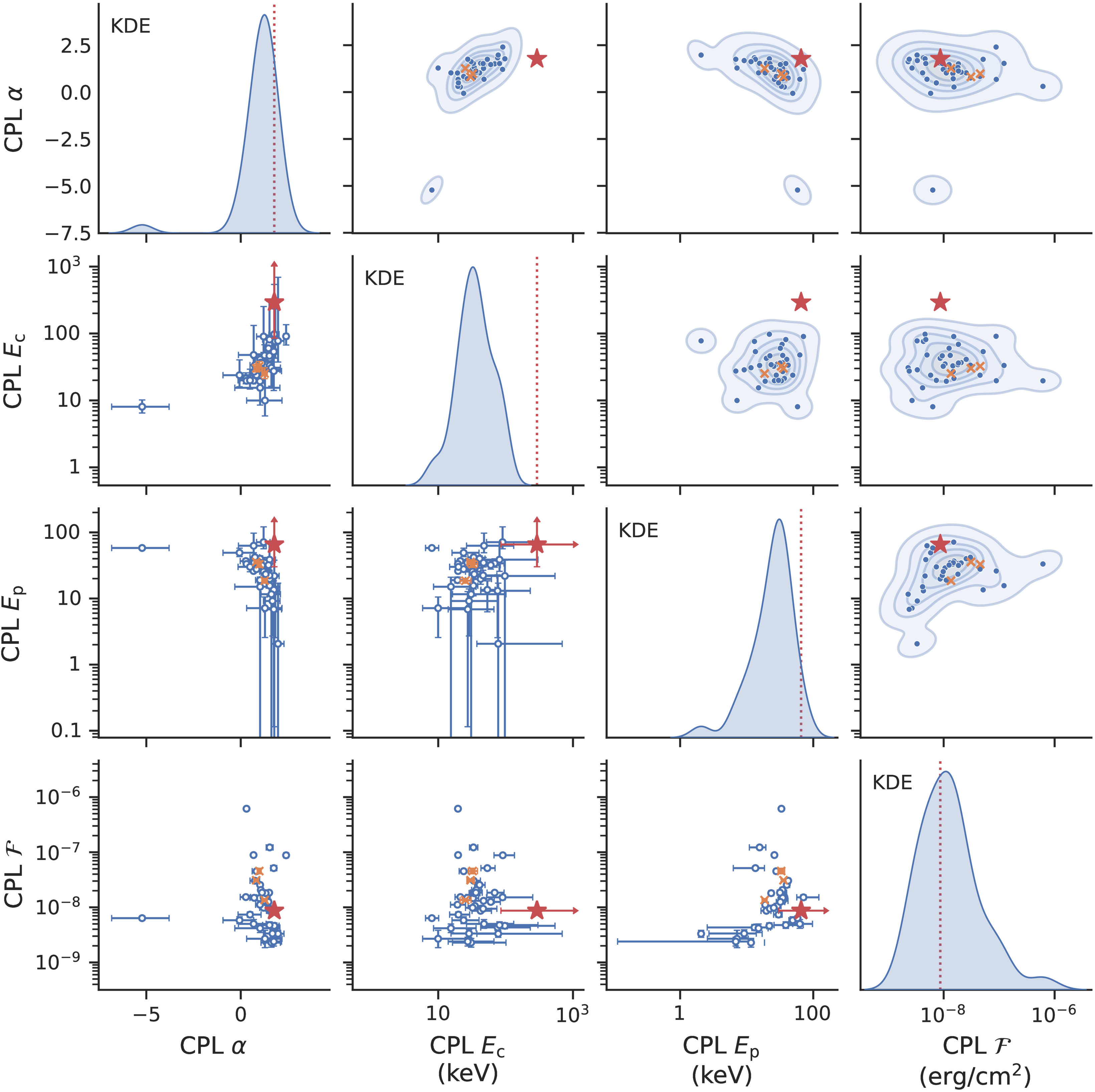 The distribution and correlation between CPL spectral parameters and burst properties. The red star and red dashed line represent the RB-MXB 221021. The crosses in each panel represent the unreliable results due to the saturation of the HE telescope.