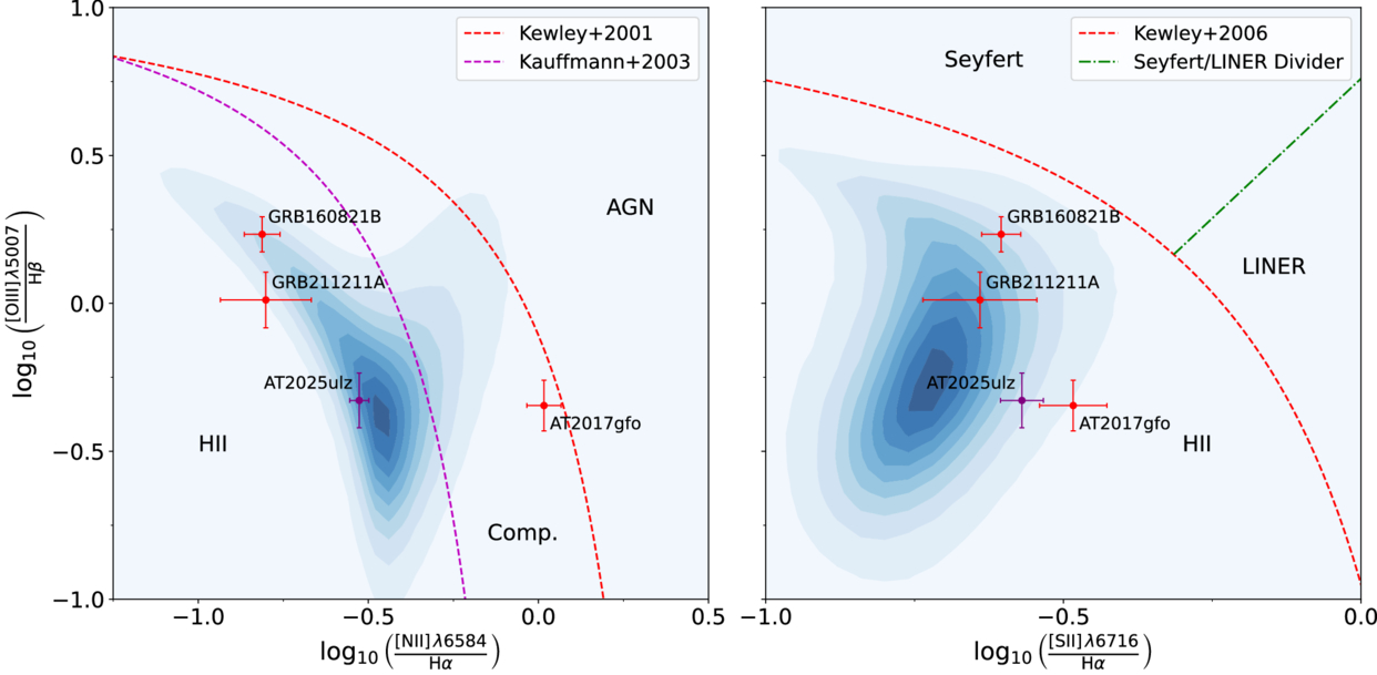A BPT (J. A. Baldwin et al. 1981) analysis of the host of AT2025ulz (violet) based on its DESI spectrum and including for comparison the host galaxies of known gamma-ray bursts with an associated candidate KN (GRB160821B and GRB211211A) observed by DESI. The galaxy is a standard star-forming galaxy, similar to the hosts of known GRB-KN. Notably, the host of AT2017gfo (associated with GW170817) has weak AGN lines that are not present in any of the other galaxies (A. Palmese et al. 2017). The background contours are made from the FastSpecFit value-added catalog for DESI DR2 data (FastSpecFit version 3.2.0; J. Moustakas et al. 2023; DESI Collaboration et al. 2025b; J. Moustakas et al. 2026, in preparation). Separation lines are drawn from L. J. Kewley et al. (2001), G. Kauffmann et al. (2003), and L. J. Kewley et al. (2006).
