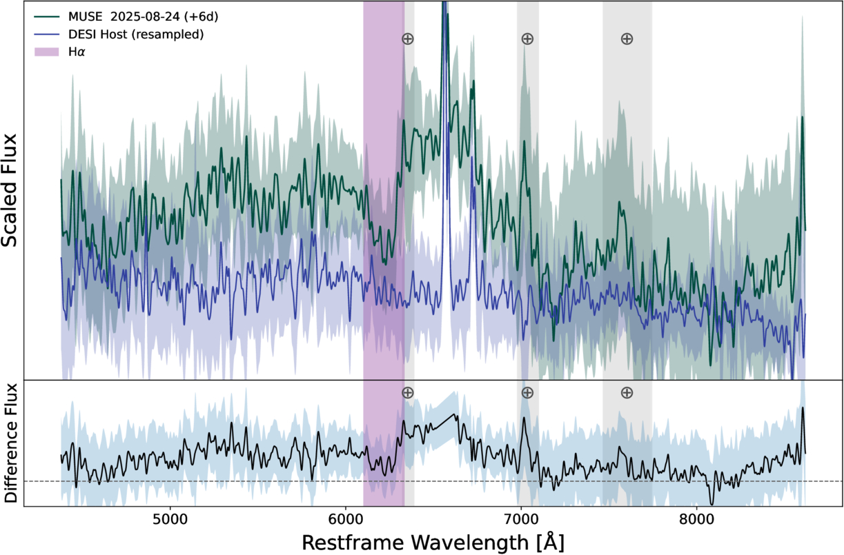 MUSE spectrum of AT2025ulz reported by S. Banerjee et al. (2025a) and DESI host spectrum of AT2025ulz. The MUSE spectrum classifies AT2025ulz as a Type IIb SN. The top panel shows both spectra normalized by their median flux while the bottom panel shows the MUSE spectrum with the DESI spectrum subtracted. Tellurics are denoted with ⊕ and the Hα and N II complex is masked out in the subtraction. A clear P Cyg Hα shape can be seen.