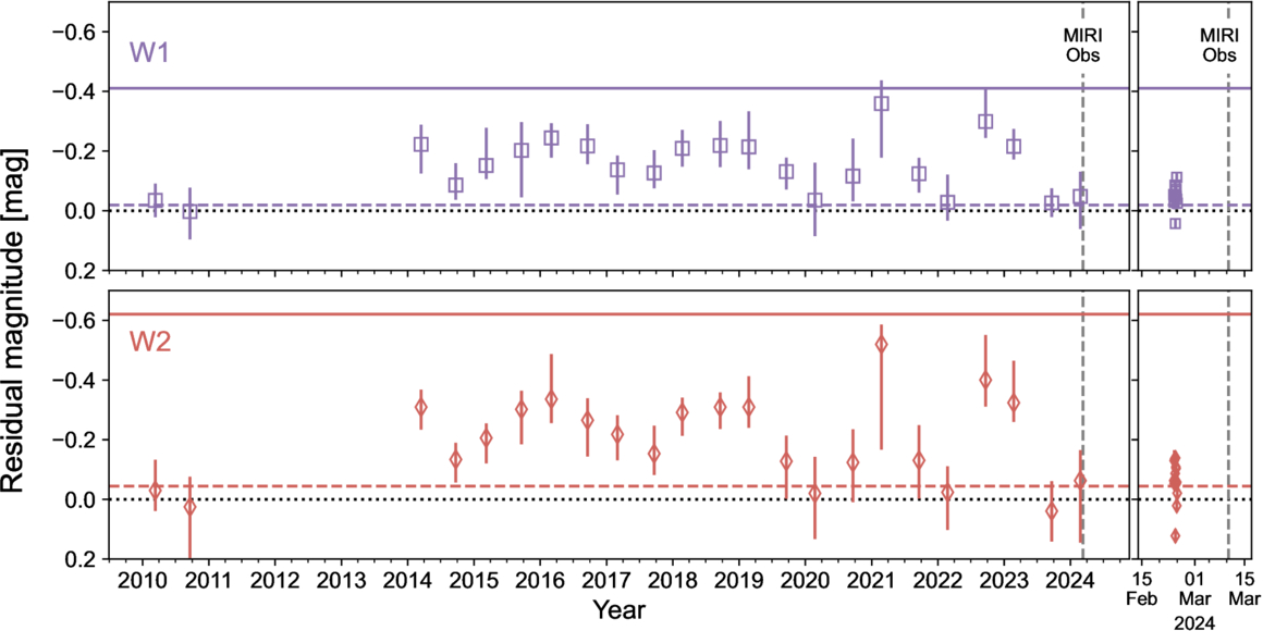 Left: the light curve of CVSO 1942 from the ALLWISE (2010–2011) and NEOWISE (2014-2024) survey. The photosphere has been subtracted. The horizontal lines indicate the levels extrapolated by the models that fit the 2005 Spitzer observation (dashed lines) and the 2024 JWST observation (solid lines). The horizontal dotted lines show the photospheric level, and the vertical dashed line shows the date of the JWST observation, which was 2 weeks after the last NEOWISE observation. The data points are binned to 7 days. Right: the zoom-in, unbinned light curve of the star around the JWST observation.