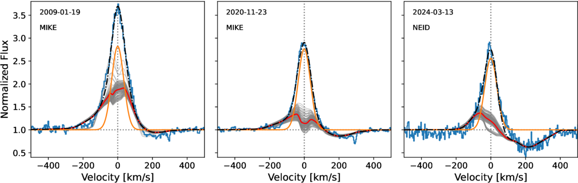 Hα profiles of CVSO 1942 across 15 yr. The blue lines represent the observations, the red lines represent the average magnetospheric model, and the gray lines represent the top 100 best-fit models. The orange lines are the average chromospheric models, and the black lines are the average total models.