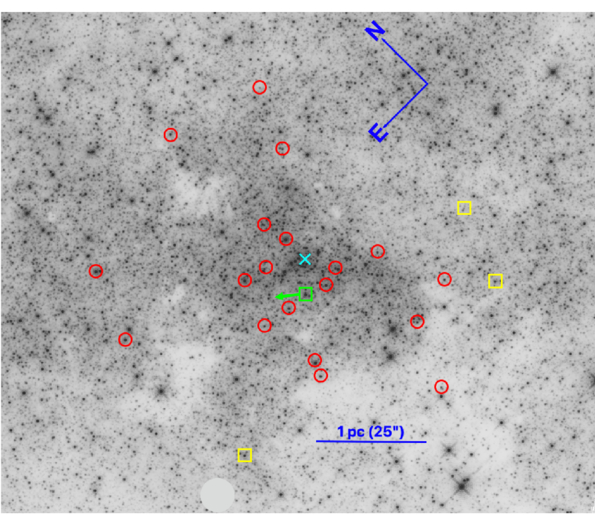 The 23 SiO masers examined in this study, overlaid on an HST F153M image. The green square represents IRS 9, which is found to exhibit a velocity larger than the maximum escape velocity at its radius (i.e., it is locally unbound from the GC). The green arrow shows the direction of its HST proper motion (not to scale). The yellow squares correspond to three masers proposed to be locally unbound (SiO-16, SiO-21, and SiO-25), but the new HST proper motions indicate that they do not exceed their maximum escape velocities. The red circles show the positions of the other masers in the sample. All sources have projected distances of R ≤ 45″ (∼1.8 pc) from SgrA* (cyan cross).