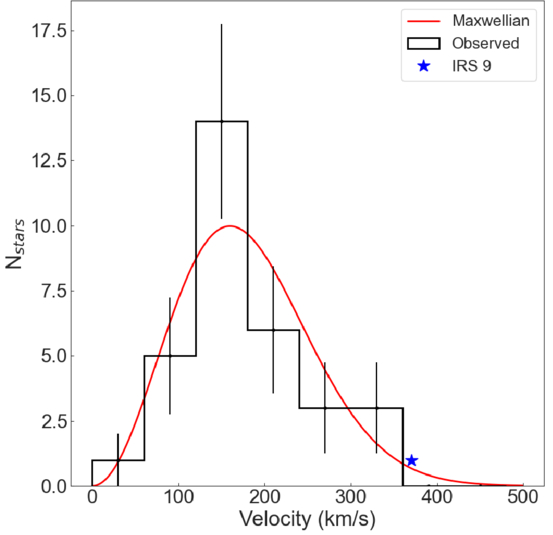 The observed v3d distribution of 32 stars with projected radii within ±1″ of IRS 9 (black histogram), compared to the v3d of IRS 9 itself (blue star). The expected v3d distribution of the NSC is taken to be a Maxwellian distribution with a scale parameter equal to the velocity dispersion at this radius derived from a dynamical model of the NSC (S. Chatzopoulos et al. 2015; red line). From this distribution, we calculate that the probability of observing a star with a v3d greater than or equal to IRS 9 is ∼1%.