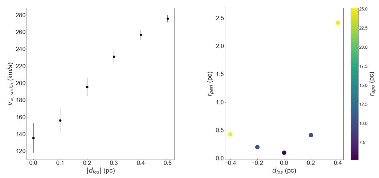 Different calculated properties for the orbit of IRS 9 as a function of dlos. Left: v∞,smbh increases as ∣dlos∣ increases, and so the reported value for the dlos = 0 pc case (v∞,smbh = 134 ± 18 km s−1) represents a lower limit. Right: rperi as a function of dlos, with the color of each point corresponding to rapo. The minimum values for rperi and rapo are obtained for the dlos = 0 pc case, which represents the “tightest” possible orbit for IRS 9 in the GC.