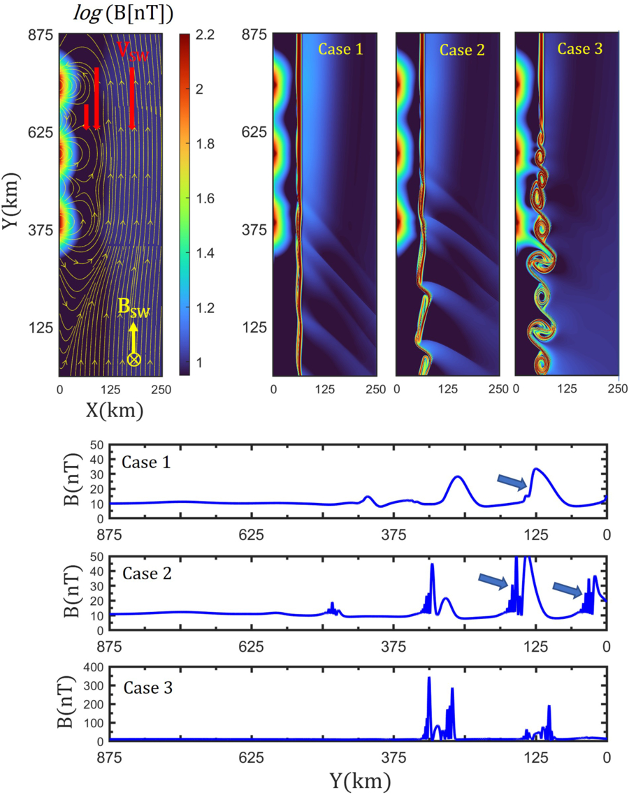 Simulation results showing the nonlinear evolution of the KHI. The leftmost panel displays the equilibrium magnetic field magnitude on a logarithmic scale, with yellow lines as field lines and red arrows indicating solar-wind flow over three subsurface dipoles. The three panels to the right show nonlinear outcomes for Cases 1–3 with decreasing solar-wind speeds. KHI-driven fast-mode shocks form and extend upward in Cases 1–2, while Case 3 yields large-amplitude vortex structures. The lower three panels show magnetic variations at 100 km altitude, demonstrating upstream-steepened profiles for shock-like EMEs (blue arrows indicating the steepened side) and strongly oscillatory signatures for vortex-type EMEs.