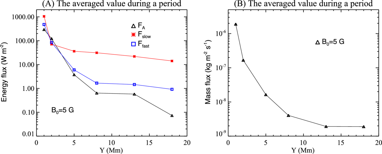Averaged upward energy fluxes (A) and mass flux (B) within a cycle of spicule formation at different altitudes in the higher resolution case are presented.