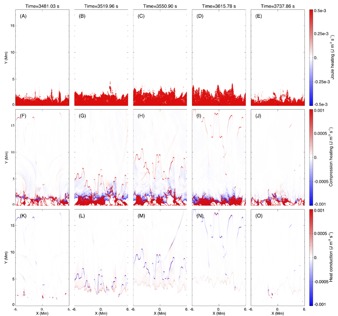 Evolutions of the energy density change rate contributed by three different physical effects within a cycle of spicule formation in the 2.5D run with B0 = 5 G. Distributions of the Joule heating (﹩\eta {J}_{z}^{2}﹩) (A–E), compression heating (−P ∇ · V) (F–J), and heat conduction (− ∇ · FC) (K–O) are presented.