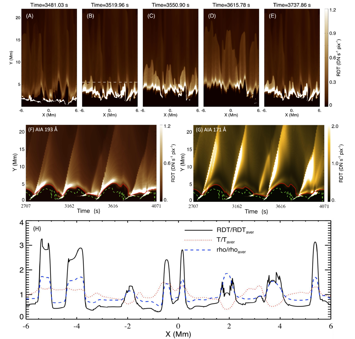Evolution of the synthesized emission count rate in the 2.5D run with initial magnetic field B0 = 5 G. Panels (A)–(E) show the distributions of the synthesized emission count rate in AIA 193 Å at five different times within a cycle of spicule formation, as in Figure 4. The animations of the corresponding synthesized emission count rate in AIA 171 and AIA 193 Å are available in the online journal. Panels (F) and (G) show the synthesized results varying with time along the Y-direction at X = −4.15 Mm. Here, RDT is the synthesized emission count rate, and the unit of RDT is DN s−1 pixel−1. The red solid curve and the green dashed curve in panels (F) and (G) correspond to the two locations where T = 80,000 and 8000 K, respectively. Panel (H) presents the distributions of the normalized synthesized emission count rate in AIA 193 Å (black solid line), the normalized plasma temperature (red dotted line), and normalized density (blue dashed line) along the X-direction at Y = 5.5 Mm (the white dashed line in Figure 9(B)) at t = 3519.96 s.