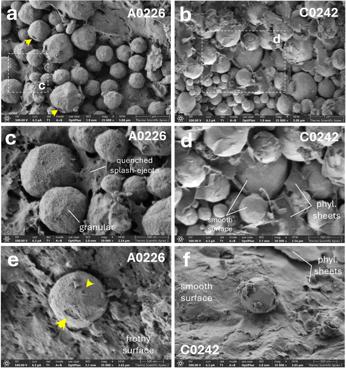 Electron microscope images in secondary electron (SE) mode of magnetite grains in A0226 and C0242 particle surfaces. (a) Panoramic SE image of framboidal magnetite on the A0226 surface, showing micro- to nano-impact craters (highlighted by yellow arrows), granular surface morphology, and magnetite grains interconnected by a “cobweb” texture. (b) Panoramic SE image of framboidal magnetite on the C0242 surface, showing a pristine, smooth morphology commonly associated with phyllosilicate (phyl.) sheets. (c) High-magnification view of the area in panel (a), highlighting quenched splash ejecta feature on weathered magnetite. (d) High-magnification view of the area in panel (b), showing a smooth magnetite surface and associated phyllosilicate sheets. (e) Individual magnetite grain in A0226 exhibiting nanometer impact craters on a frothy surface. (f) Individual magnetite grain in C0242 showing a smooth surface on a phyllosilicate-rich matrix.