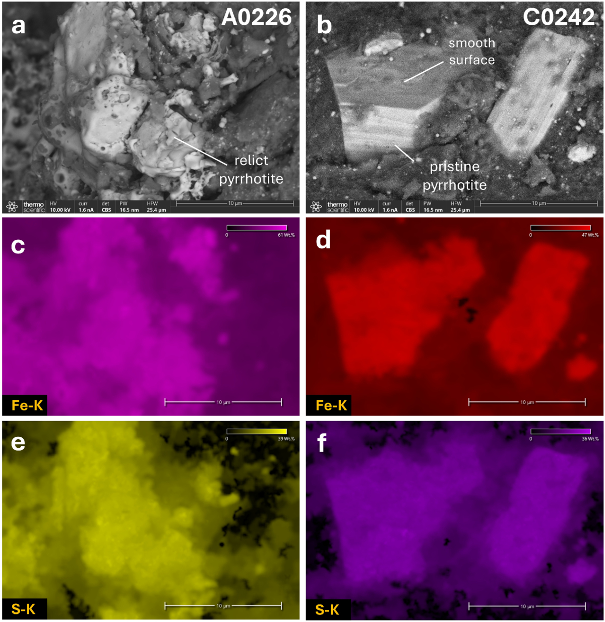 Electron microscope images and FEG-SEM–EDS analyses of pyrrhotite grains on particles A0226 and C0242. (a) Backscattered electron (BSE) image of a relict pyrrhotite grain on the surface of particle A0226, with corresponding Fe-K ((c)) and S-K ((e)) EDS elemental maps. (b) BSE image of a pristine pyrrhotite grain on the surface of particle C0242, with corresponding Fe-K ((d)) and S-K ((f)) EDS elemental maps.