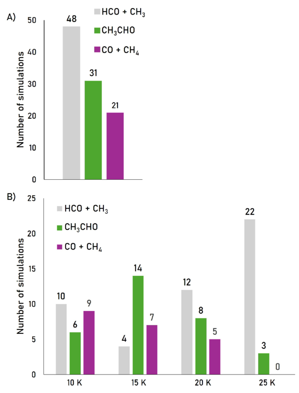(A) Number of NVE AIMD simulations as a function of the final product. (B) The same as (A), but also considering the initial temperature.