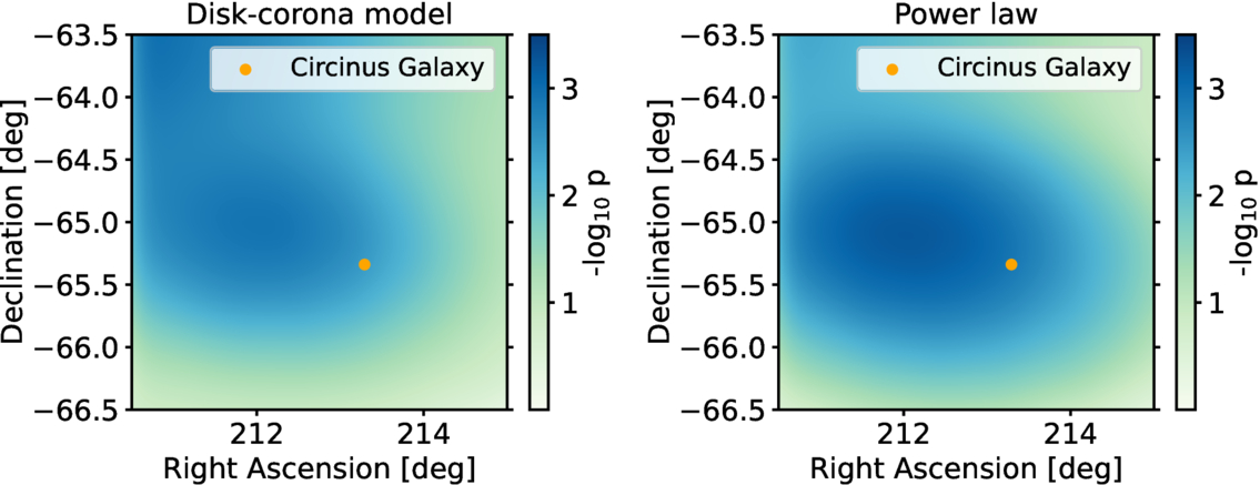 Local (pretrial) p-value maps near the most significant source—the Circinus Galaxy (orange), assuming the disk–corona model spectrum (left) and the power-law spectrum (right).