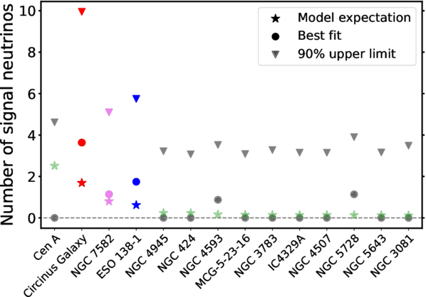 Expected (star), best-fit (dot), and 90% confidence level upper limit (triangle) number of signal neutrinos assuming disk–corona model spectra, with the three most significant sources—Circinus galaxy (red), NGC 7582 (pink), and ESO 138-1 (blue)—highlighted. Sources from left to right have a decreasing number of expected signal neutrinos. The ambiguous origin of the X-ray emission from Centaurus A introduces large uncertainties in the expected neutrino flux; therefore, we include it in the individual source search but not in the weighted stacking analysis.