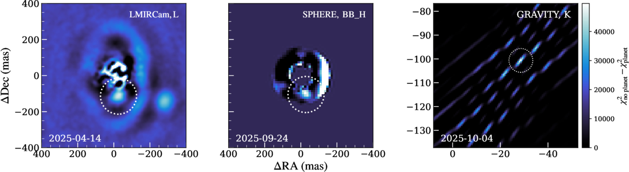 Left: original L-band detection of CC 1 in L. M. Close et al. (2025a). Middle: new H-band detection of WISPIT 2 c following RDI. We show a confined annulus that was used for optimal stellar signal subtraction. Note that the bright arch on the right side of the annulus is the forward scattering side of the circumstellar disk. Right: detection map of the WISPIT 2 c planet with VLTI/GRAVITY on the night of 2025 October 4. The map shows the periodogram power maps of a point source companion as a function of angular offset from the star, where the companion location corresponds to the strongest peak.