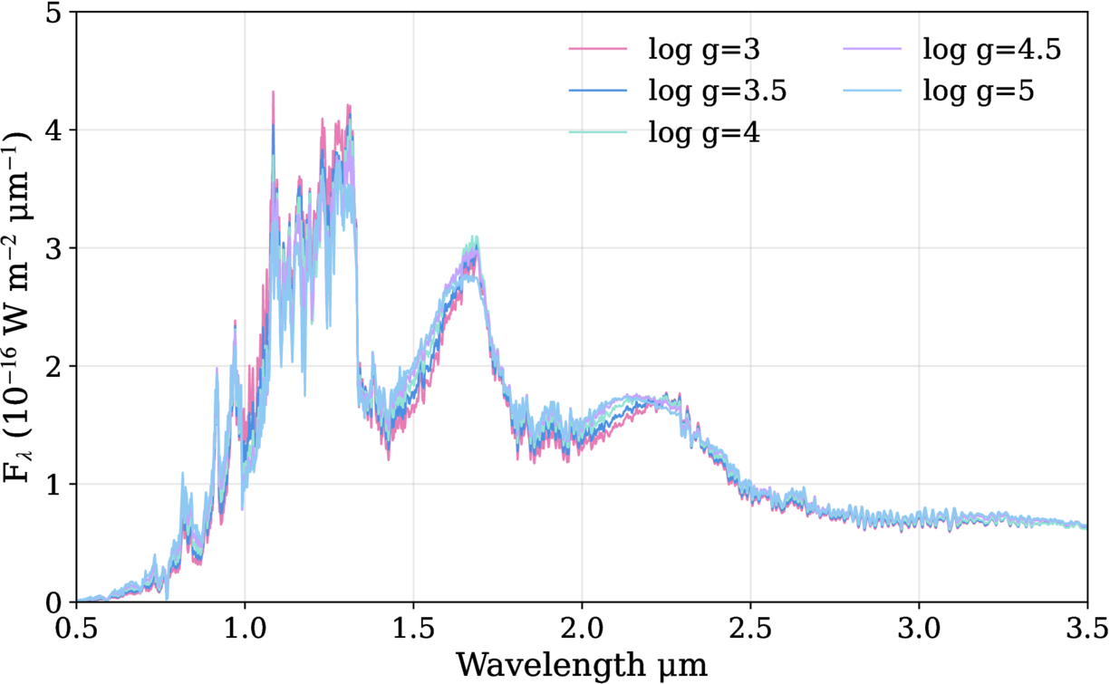 Drift-Phoenix model spectrum of the WISPIT 2 c atmosphere with varying log g, at a fixed temperature of 1750 K and a radius of 1.78 RJup.
