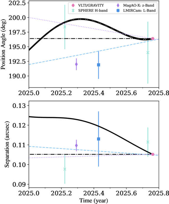 Relative astrometry of WISPIT 2c to the primary star over time. We give the separation and position angle (measured from north over east). The purple dashed line indicates plausible orbital motion for a prograde orbit, while the blue dashed line indicates retrograde motion. Both orbits are in the plane of the circumstellar disk. The solid curved line indicates the expected behavior for a distant background object, while the black dashed line represents no relative change of motion in relation to the host star.
