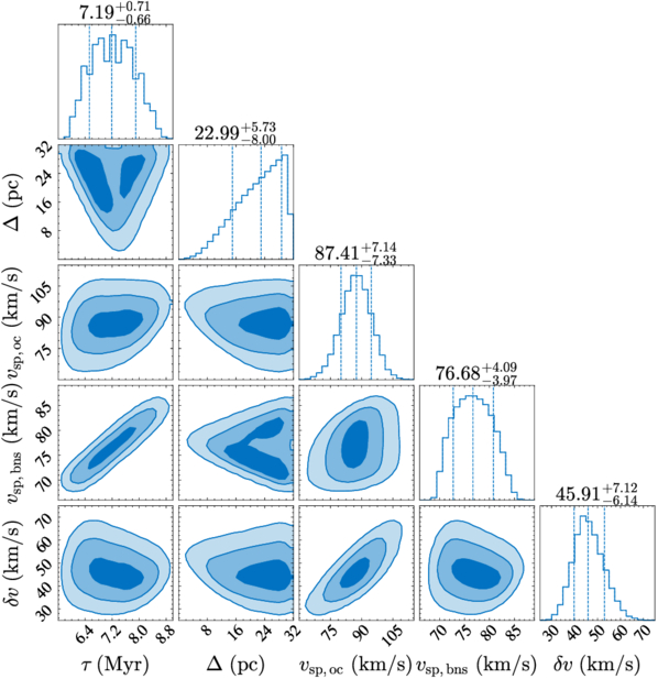 Distributions of encounter lookback time (τ) and ejection parameters for the pair J0737–3039 and Theia 58, as listed in Table 4.