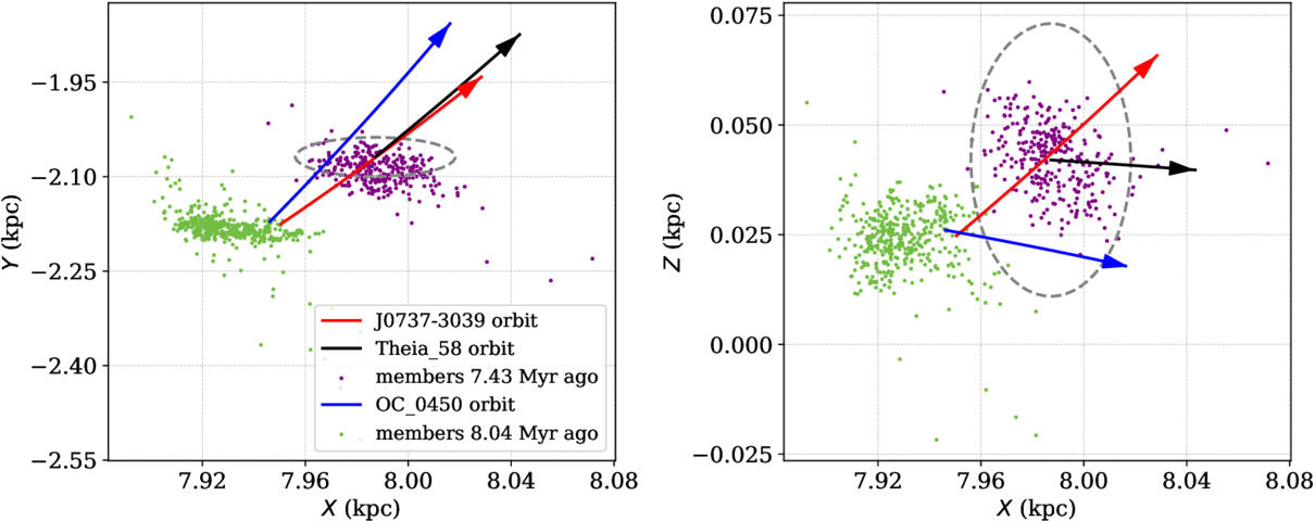 Past trajectories of the double pulsar J0737–3039 (red line) and its two candidate birth open clusters, OC 0450 (blue line and green points for member stars) and Theia 58 (black line and magenta points for member stars). The dashed gray circle marks the 3r50 boundary of Theia 58. The assumed present BNS radial velocity is 66.25 km s−1. The trajectories intersect Theia 58 at 7.43 Myr and OC 0450 at 8.04 Myr lookback time.