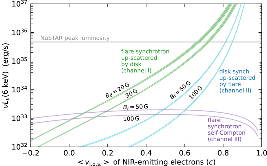 Predicted X-ray flare luminosities arising from Compton upscattering of disk and flare synchrotron photons as a function of the line-of-sight bulk velocity of the IR-emitting flare source: IR flare photons by thermal electrons in the disk (green), submillimeter photons from the disk by the nonthermal electrons in the IR flare source (cyan), and SSC in the IR flare source (purple). The gray line indicates the peak X-ray luminosity detected by NuSTAR: this can only be achieved if the IR-emitting electrons are moving away from the observer and toward the disk with bulk speed v ∼ 0.7c. The thickness of the Channel I and II curves shows the flare source size dependence (see text for further explanation).