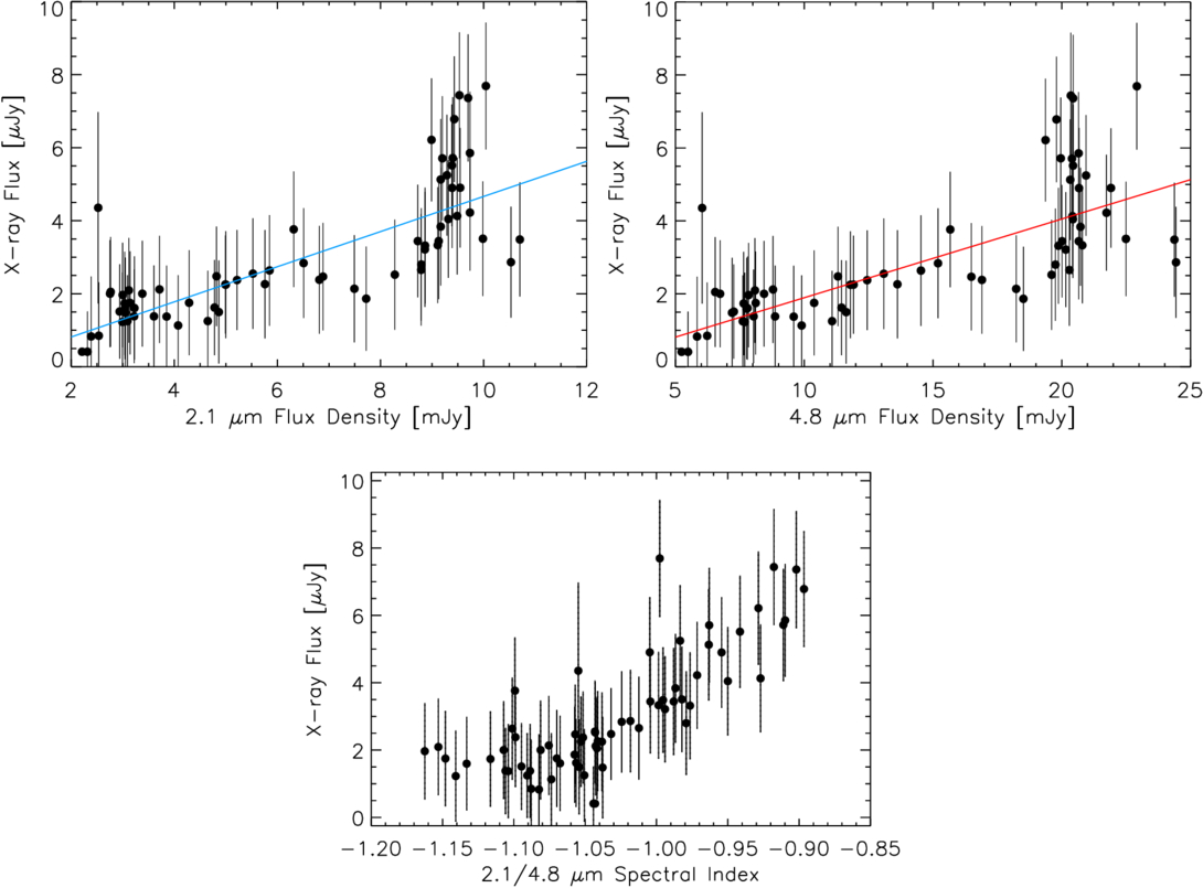(Top left) Correlation of X-ray flare emission detected by NuSTAR with NIR flare emission at 2.1 μm, illustrating their similar origin. (Top right) Similar to top left, but for emission at 4.8 μm. (Bottom) A plot of the spectral index of NIR flare emission against the X-ray flux density. A trend is noted in that the NIR spectral index becomes shallower as the X-ray flux increases. The colored line (top panels) is a linear fit to the full dataset, although the correlation seems to cease at ≳9 and ≳20 mJy in the IR fluxes.