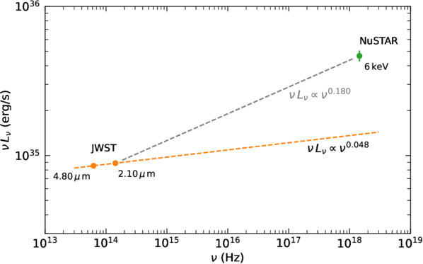 The IR to X-ray SED at the peak of the flare at UT 10.5 hr on 2024 April 5. Orange and green points show the JWST and NuSTAR peak luminosities at 4.8 μm, 2.1 μm, and 6 keV. The measurement errors of the JWST measurements are at the 1% level, within the size of the data points. Dashed lines show the power-law extrapolation of the IR spectral index (orange) and the harder power-law spectrum that would connect the 2.1 and 6 keV measurements (gray).