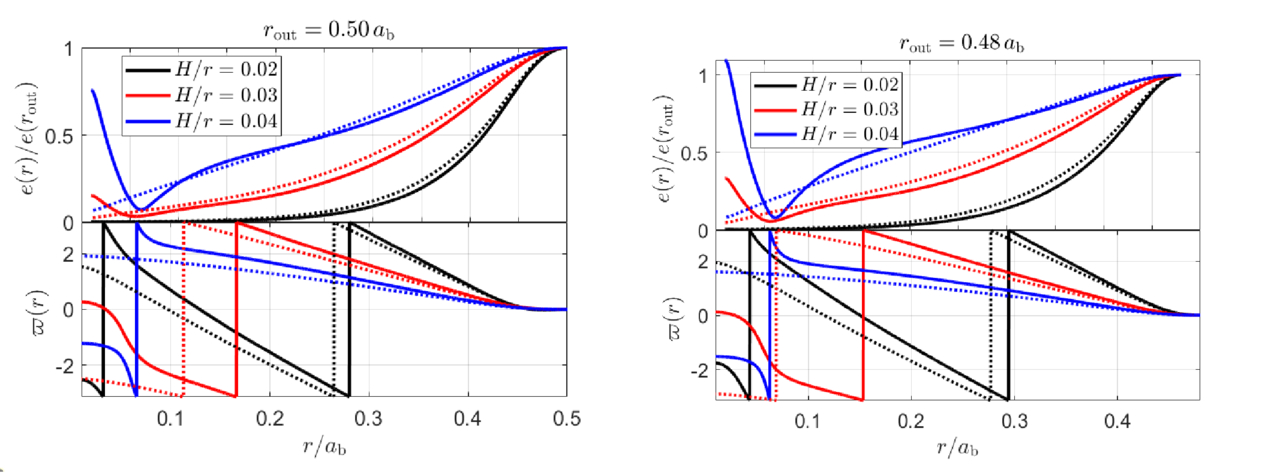The eccentricity (upper panels) and periapse angle (lower panels) versus radius of the disk for three different values of H/r and q = 0.1. The outer disk truncation radius is rout = 0.5 ab (left) and rout = 0.48 ab (right). The dotted lines show the solution to the 2D equations, and the solid lines show the solution to the 3D equations.