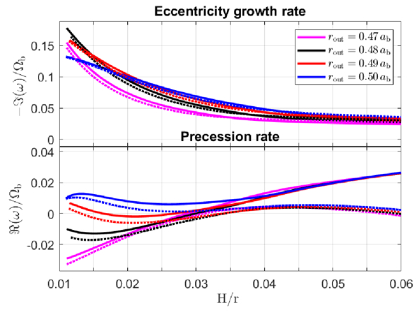 The eccentricity growth rate (upper panel) and precession rate (lower panel) as a function of H/r are shown for various disk outer radii and q = 0.1. The dotted lines show the solution to the 2D equations, and the solid lines show the solution to the 3D equations.