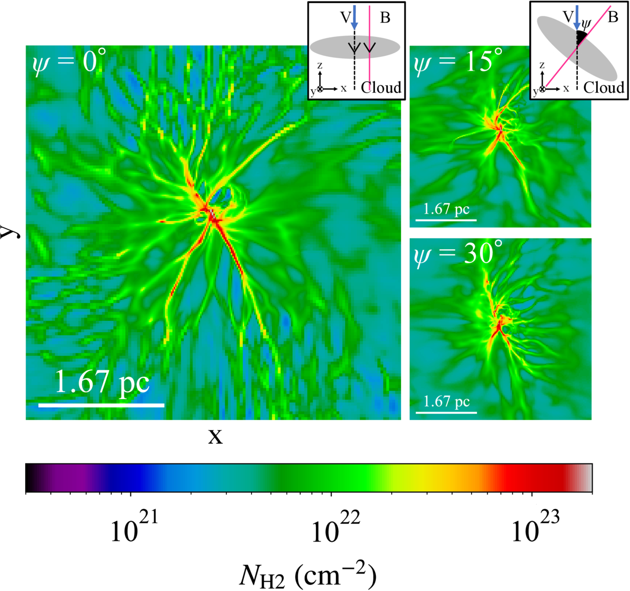 H2 column density maps in the x–y plane at t = 0.5 Myr after the shock sweeps the cloud for different inclination angles ψ between the shock propagation direction and the magnetic-field axis. The panels show ψ = 0°, 15°, and 30°. The color scale represents the H2 column density integrated along the z-axis. The box size is 5.0 pc on each side. Small inset schematics in each panel illustrate the definition of the inclination angle ψ (between the shock propagation direction and the magnetic-field axis) and the corresponding initial cloud-field geometry; the gray shape, magenta line, and blue arrow indicate the initial cloud density profile, magnetic-field direction, and shock propagation direction, respectively.
