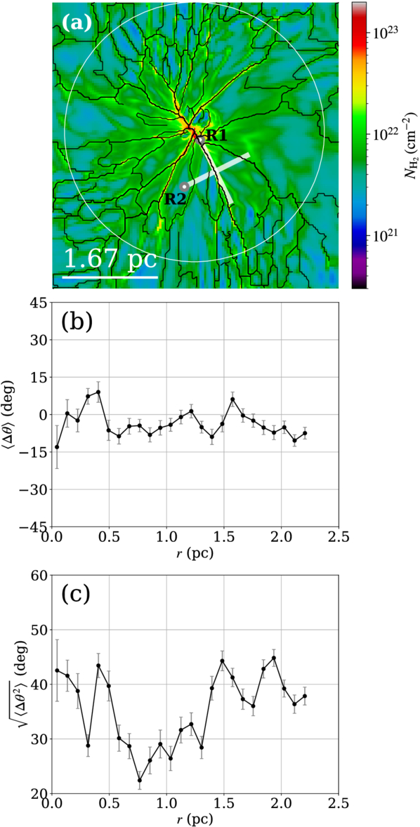 (a) H2 column density map from the left panel of Figure 1, overlaid with filament skeletons identified using DisPerSE (T. Sousbie 2011; T. Sousbie et al. 2011). The lines labeled R1 and R2 denote cuts parallel and perpendicular to the filaments, respectively (see Figure 4 for details). The white circle (diameter of 4.5 pc) indicates the region centered on the density peak. (b)–(c) Radial profiles of the mean angle 〈Δθ〉 (b) and the rms angle (c) of the filaments relative to the radial vector from the hub center. The hub center is defined as the column density peak, distinct from the geometric center of the simulation box. The angle Δθ ranges from −90° to 90°, where 0° corresponds to the radial direction. The plots cover the region within the white circle in (a). Error bars represent the standard errors.