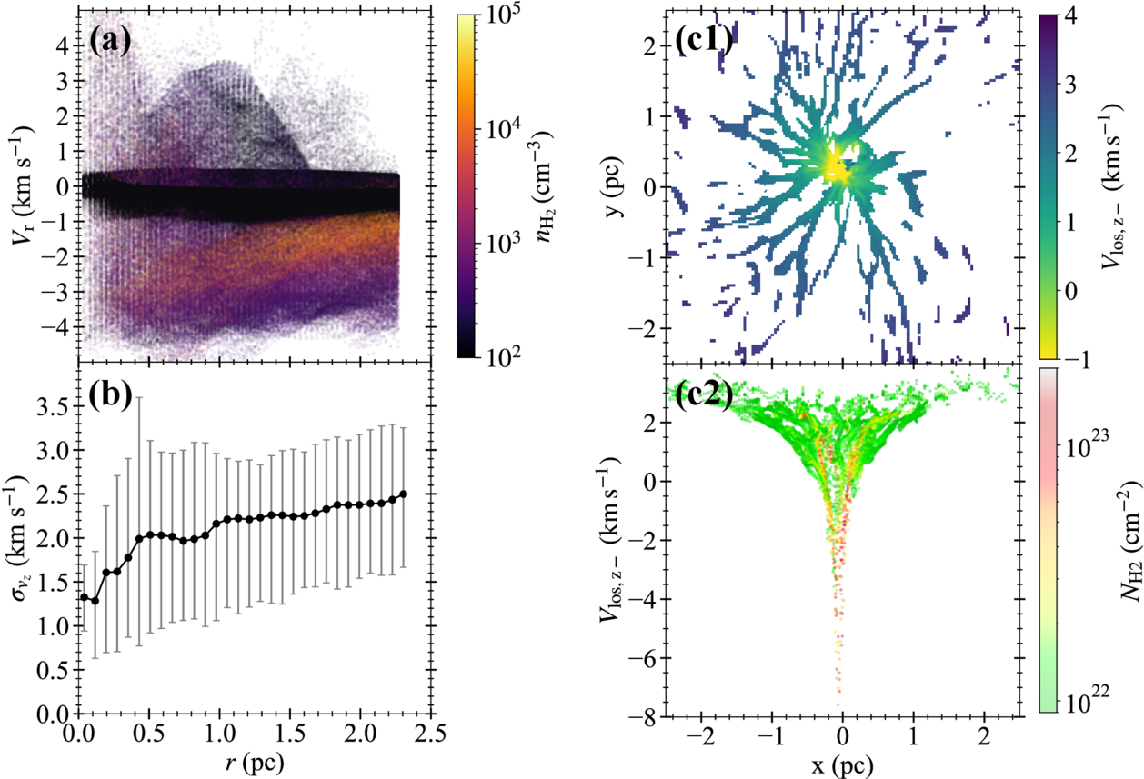 Velocity structure of the HFS 0.5 Myr after the shock impact. (a) Radial velocity Vr plotted as a function of the cylindrical radius r from the hub center. Vr and r are defined in a cylindrical coordinate system aligned with the z-axis. The color of each point corresponds to the H2 number density. Only cells within a cylindrical radius of r = 2.25 pc are plotted. (b) Median of the density-weighted velocity dispersion ﹩{\sigma }_{{v}_{z}}﹩ along the z-axis as a function of r. Error bars indicate the 95% confidence intervals. Note that in both panels, the hub center is defined as the position of the peak gas density at this epoch and does not coincide with the origin of the computational domain. (c1 and c2) Observationally motivated kinematic maps constructed from the same snapshot as in the left panel of Figure 1. (c1) Column-density-selected line-of-sight velocity map. Only regions with ﹩{N}_{{{\rm{H}}}_{2}}\gt 8\times 1{0}^{21}\,{{\rm{cm}}}^{-2}﹩, corresponding approximately to the mean column density of the identified filaments, are included. The line-of-sight velocity components are measured along the z-axis from an observer located at z = −∞ and are shown in the laboratory frame. (c2) Position–velocity (PV) diagram showing the line-of-sight velocity Vlos,z− as a function of the projected x-coordinate, weighted by the column density.