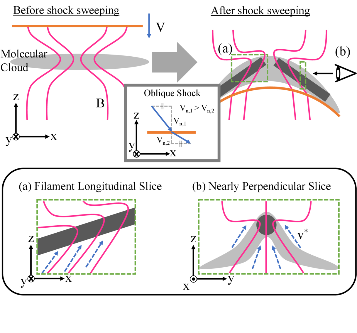 Schematic illustration of a fast-mode shock propagating through a self-gravitating molecular cloud with hourglass-shaped magnetic-field lines. The upper panels show a two-dimensional slice in the x–z-plane, in which the cloud is flattened along the z-direction. The grayscale shading represents the gas density. The blue arrows indicate the velocity field, the magenta curves show the magnetic-field lines, and the orange line represents the shock front. (a) Longitudinal slice of the filament, corresponding to cut R1 in Figure 4. (b) Nearly perpendicular slice of the filament, corresponding to cut R2. The velocity v* denotes the velocity in the shock rest frame.