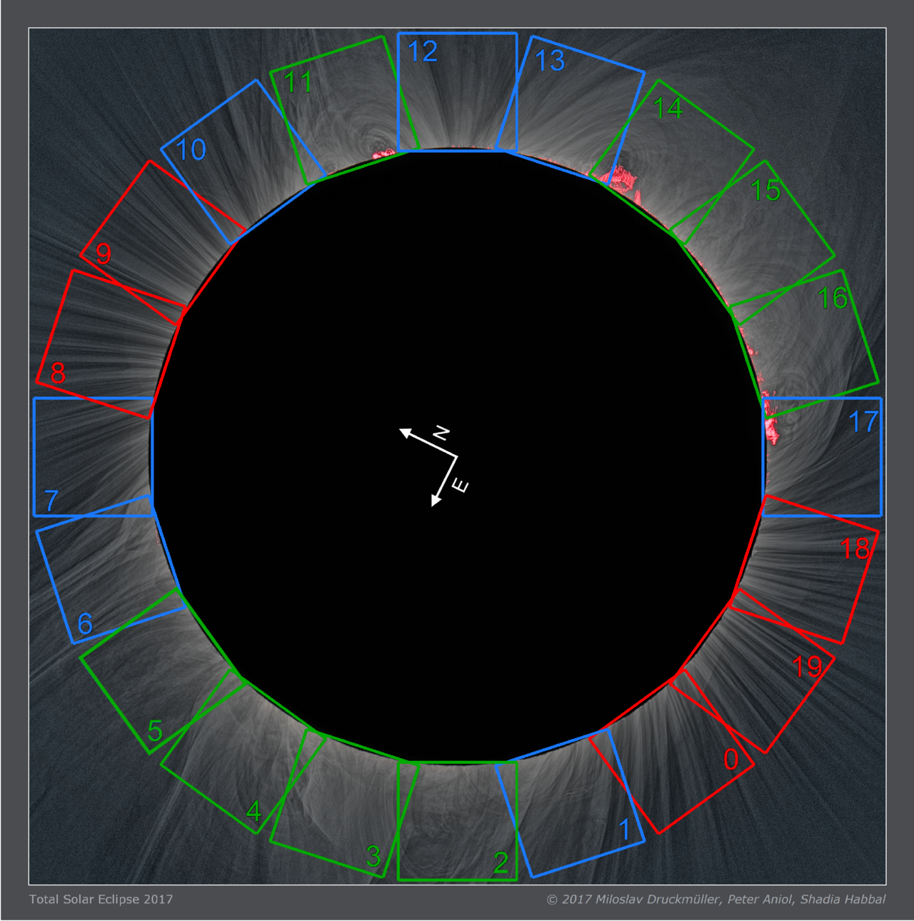 Highest-resolution WL image of the solar corona taken during the TSE of 2017 August 21, from Oregon, USA, which shows some chromospheric emission and several prominences. There are 20 selected 400 × 400 pixel2 subregions marked for the turbulence analysis. In this work, green boxes denote closed-field, loop-like equatorial regions; red boxes mark open-field, ray-like regions; and blue boxes mark regions where there is a mix of both along the line of sight. Each subregion spans a radially projected physical size of ∼0.4 R⊙ and samples coronal structure within this heliocentric distance.