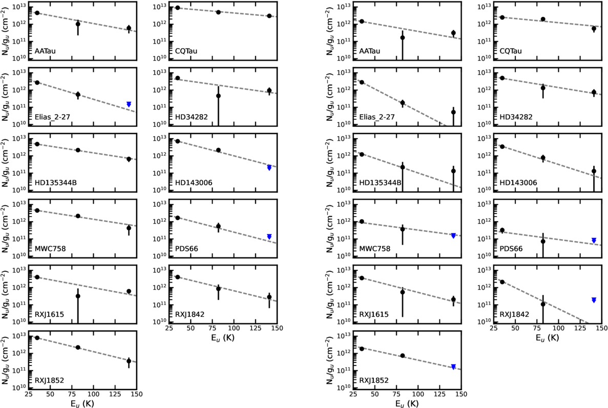 Rotational diagrams of the 11 targeted disks for the inner 100 au (left) and 100–200 au region (right). Blue triangles represent upper limits for undetected transitions, and the dotted lines show the best MCMC fit. In AA Tau, HD 34282, MWC 758, and RX J1615, it is possible that there is more than one emitting component.