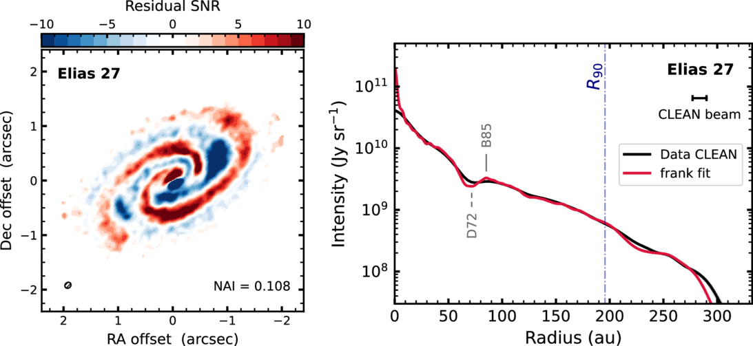 Left: residuals obtained by subtracting an axisymmetric frank model from the continuum data emission of Elias 2–27. Right: radial profile from the frank model and with the CLEAN algorithm. NAI is calculated following the same procedure detailed in P. Curone et al. (2025).