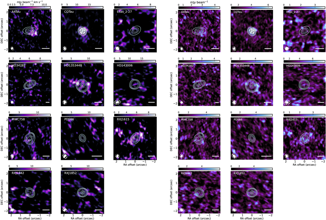 Same as Figure 1 but for the H2CO 4(3,2)–3(3,1) and 4(3,1)–3(3,0) lines. In this case, we show the average of the two respective moment maps of each line.