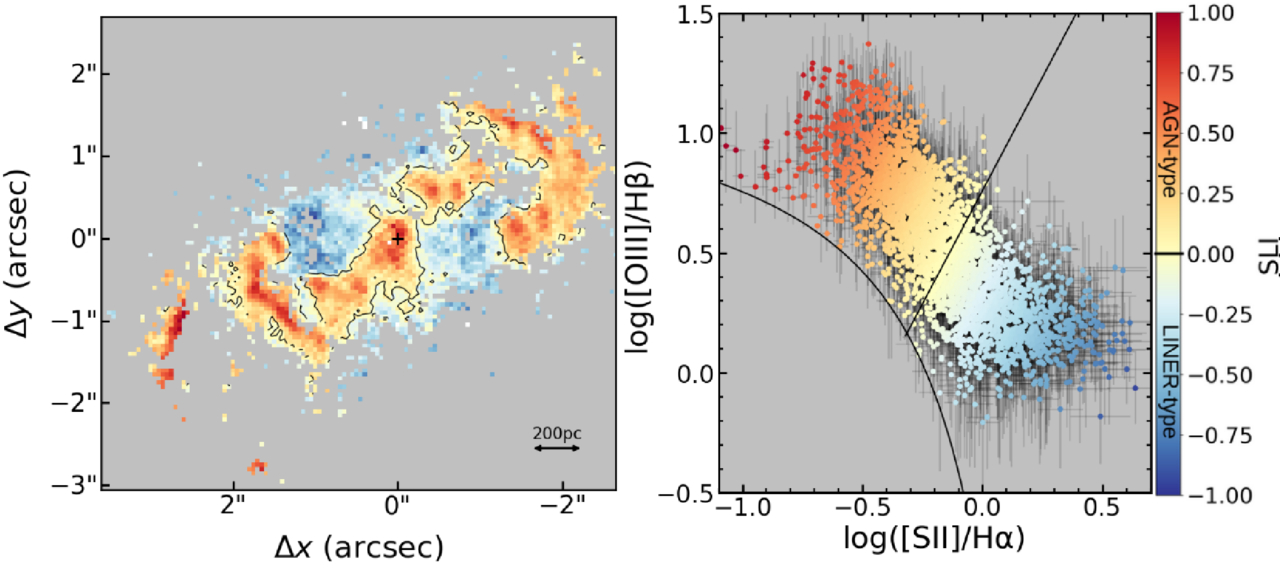 SLI map and diagram for Mrk 573. Left panel: SLI map, with colors reflecting SLI values, i.e., the distance of each pixel from the Seyfert/LINER division line in the VO diagram. Black contours trace points on the Seyfert/LINER division line (SLI = 0). The black “X” marks the position of the nucleus. Right panel: corresponding VO diagram, with red indicating Seyfert-like excitation and blue denoting LINER-like excitation. The color intensity scales with the SLI value.