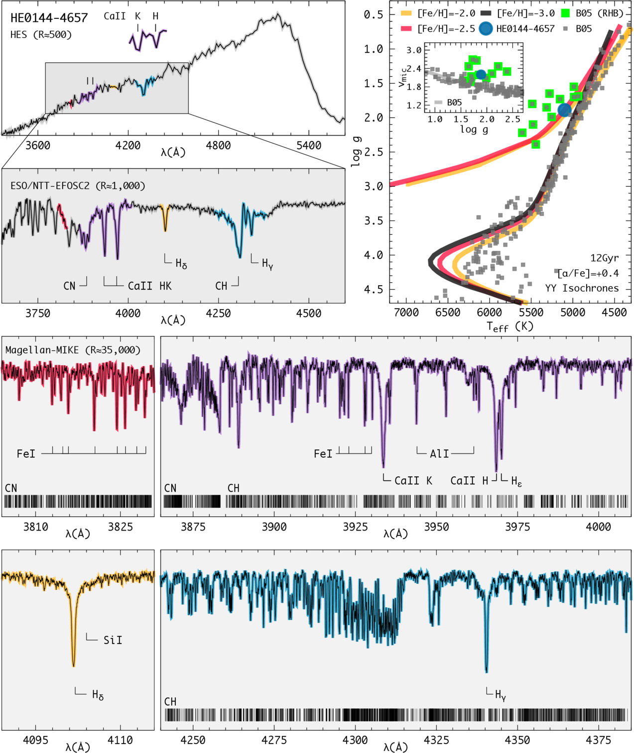 HE 0144−4657, as observed from HES (top left), NTT/EFOSC2 (second row from the top left), and Magellan/MIKE (bottom two rows). The different color lines reference the same regions in each spectrum, highlighting the difference in resolution. Absorption features and molecular bands of interest are labeled throughout. Top-right panel: Teff versus ﹩\mathrm{log}\,g﹩ for HE 0144−4657 (blue circle), together with data from P. S. Barklem et al. (2005; gray squares, with green highlights for RHB stars). Solid lines show YY isochrones from P. Demarque et al. (2004) with 12 Gyr, 0.8 M⊙, [α/Fe] = +0.4, and [Fe/H] = −2.0, −2.5, and −3.0. The horizontal-branch tracks were taken from A. Dotter et al. (2008). The inset shows ξ (km s−1) versus ﹩\mathrm{log}\,g﹩ for the same objects.