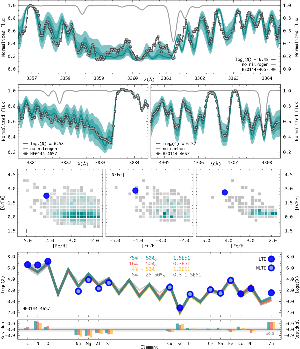 First and second rows: abundance determination via spectral synthesis for nitrogen and carbon. The filled gray squares connected by the black line represent the MIKE spectrum, the teal line is the best fit, and the shaded regions represent ± 0.15 and ± 0.30 dex from the best-fit abundance. Also shown is a synthetic spectrum without carbon and nitrogen (gray line). Third row from the top: selected LTE [X/Fe] abundance ratios as a function of [Fe/H] for HE 0144−4657 (blue circle), compared with the JINAbase (A. Abohalima & A. Frebel 2018) and SAGA (T. Suda et al. 2008) literature compilations (density map). Additional references include G. Limberg et al. (2025) and V. M. Placco et al. (2025). Bottom panel: light-element abundance pattern for HE 0144−4657 (LTE and NLTE—blue points), compared with Population III supernova yields (solid lines, residuals given as vertical colored bars). See text for details.
